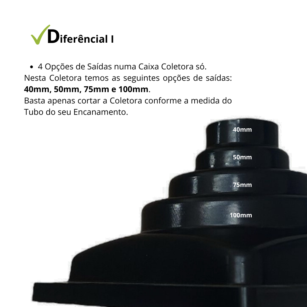 Proporciona facilidade para os projetos de drenagem de águas pluviais, coletor com saída para baixo para tubos de 40mm, 50mm, 75mm e 100mm.
