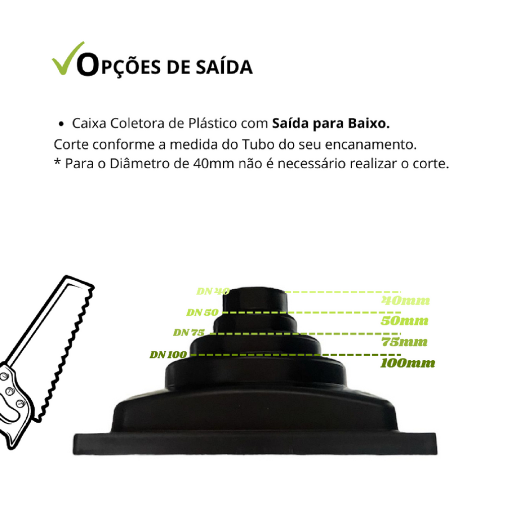 Proporciona facilidade para os projetos de drenagem de águas pluviais, coletor com saída para baixo para tubos de 40mm, 50mm, 75mm e 100mm.