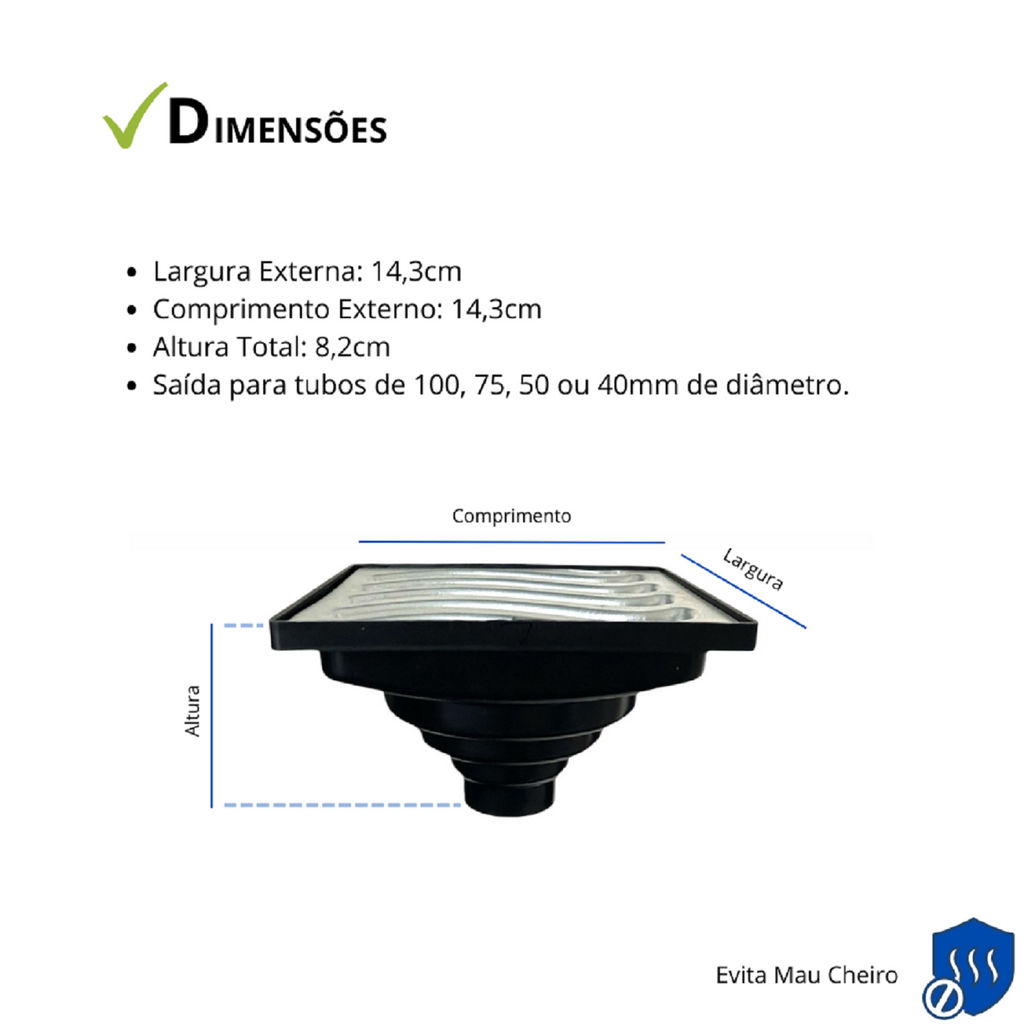 Largura 14,3cm x Comprimento 14,3 x Profundidade 8,2cm AproximadosColetor Multipla Saída Adapt uma solução prática facilitando a instalação de acordo com seu local e projeto, só cortar para encaixar na tubulação do seu local com possibilidade de 40mm, 50mm, 75mm ou 100mm